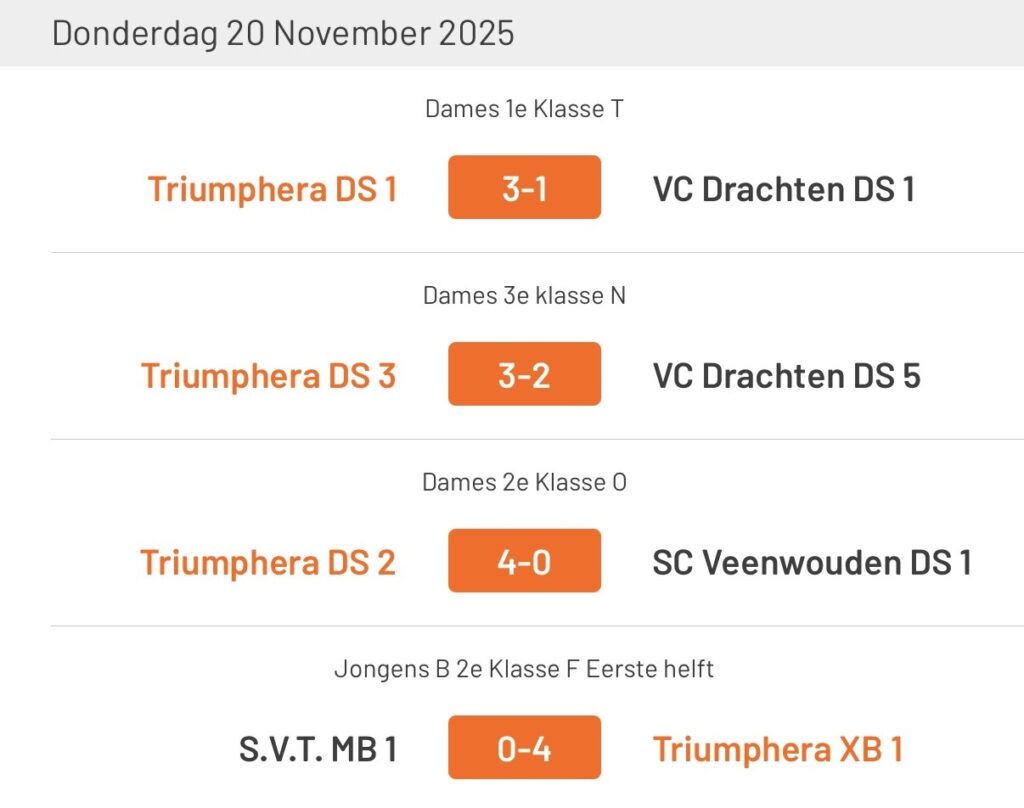 Donderdagavond laat vond de wedstrijd Triumphera D3 tegen vc Drachten D5 plaats. Dames 3 begon de eerste set sterk en zette het eigen spel direct goed neer. Het team pakte de set met 25-21, een