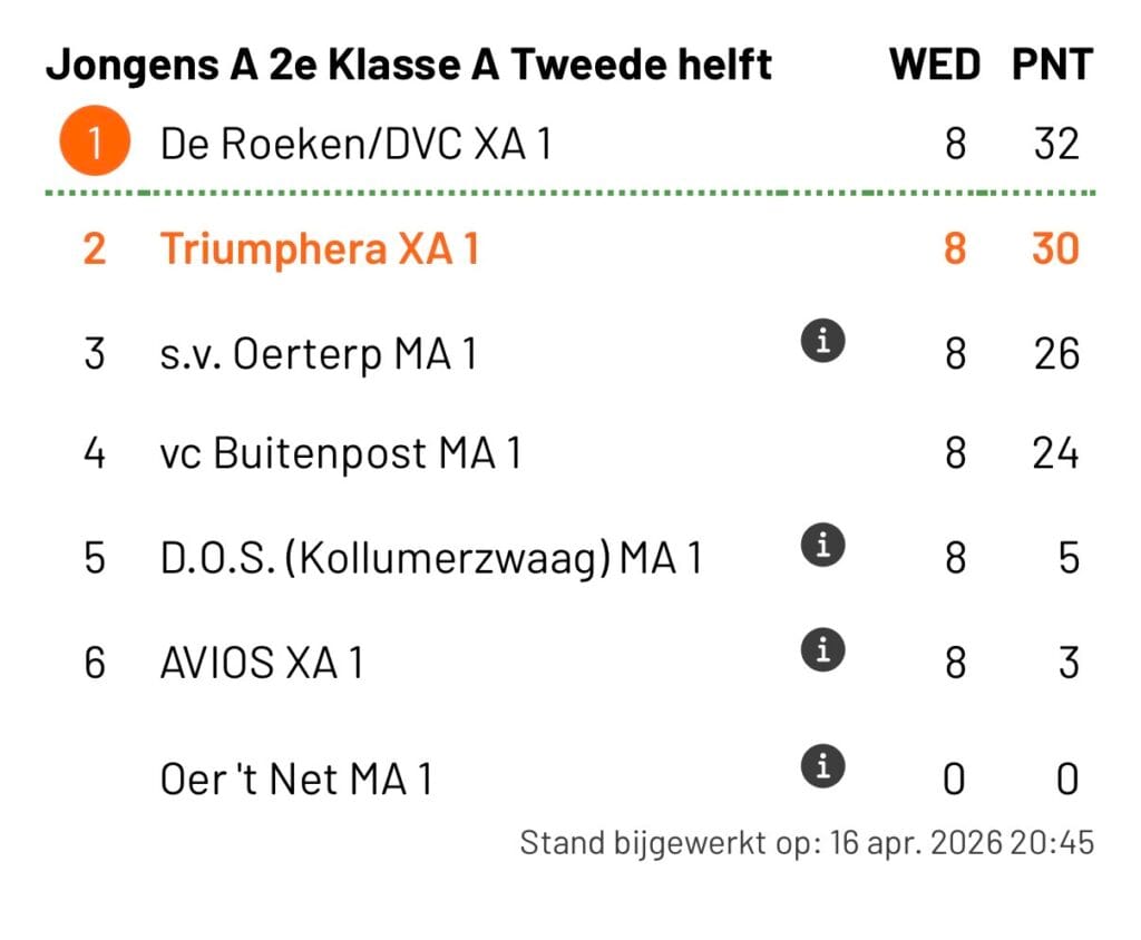 Jeugd A won afgelopen donderdag met 0-4 van vc Buitenpost MA1. Het was een mooie en spannende wedstrijd. Veel ouders, vrienden en andere familieleden waren naar Buitenpost gekomen om de jeugd aan te moedigen. En voor de volgepakte tribune wist het team dus alle vier de sets te winnen. Daarmee sluit ook de jeugd het competitie-seizoen af. En wat voor seizoen! Na de 1e competitiehelft waren ze kampioen in de b-klasse en dus vanaf januari actief in de a-klasse. Vervolgens daar als tweede eindigen in de competitie is een prestatie van formaat! De jeugd kan terugkijken op een geweldig seizoen. Als team zijn ze zoveel beter geworden en ook individueel ontwikkelt de jeugd zich stap voor stap verder.